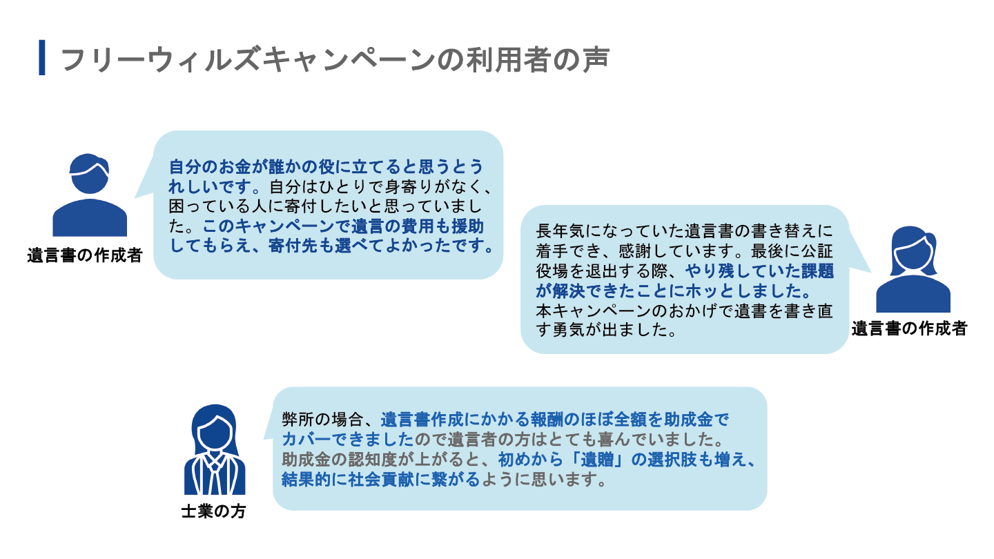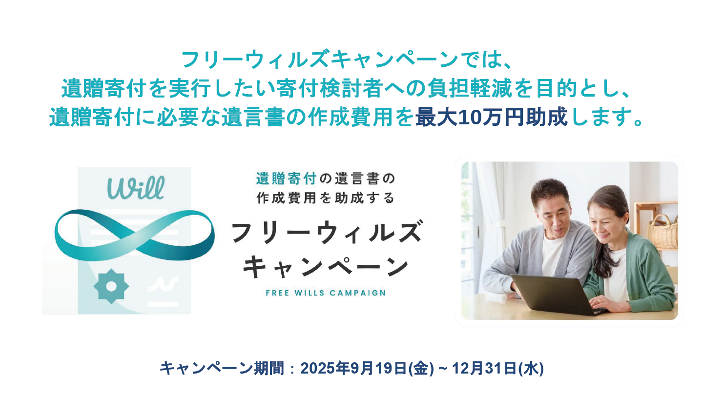 フリーウィルズキャンペーンとは、遺贈寄付の遺言書を作成する専門家報酬を助成するキャンペーンです。遺贈寄付実行のための専門家報酬の一部(最大10万円)を助成します。