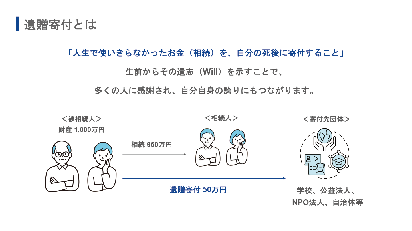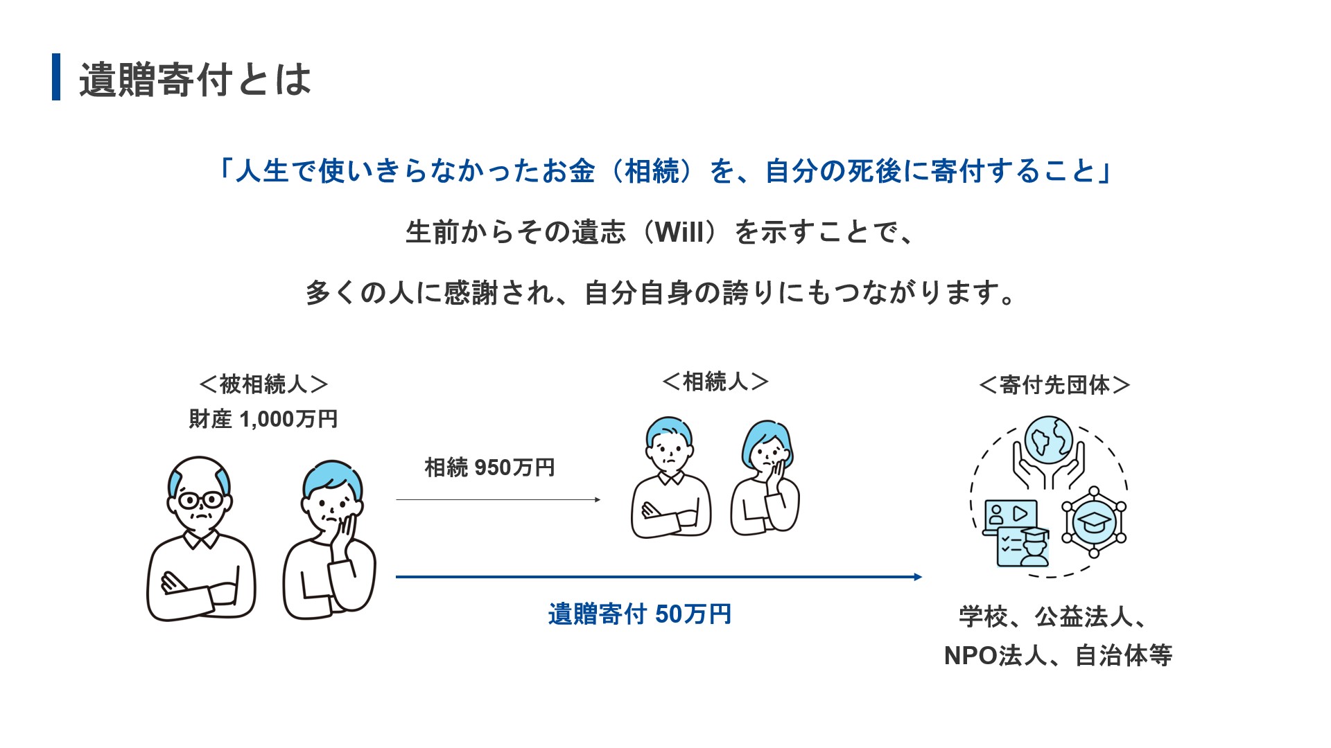 私たちは、新しい社会貢献である「遺贈寄付」が当たり前になる社会を目指しています。