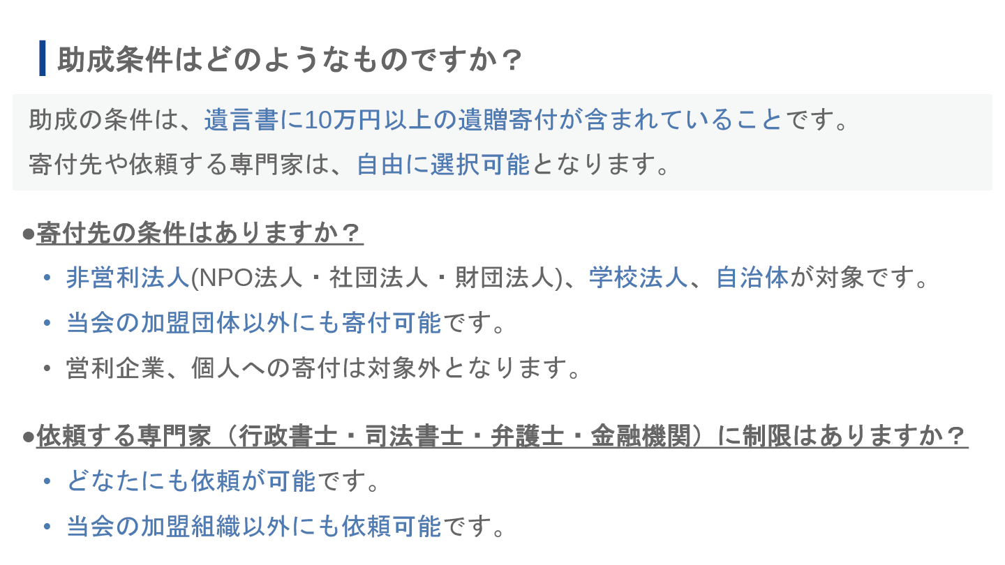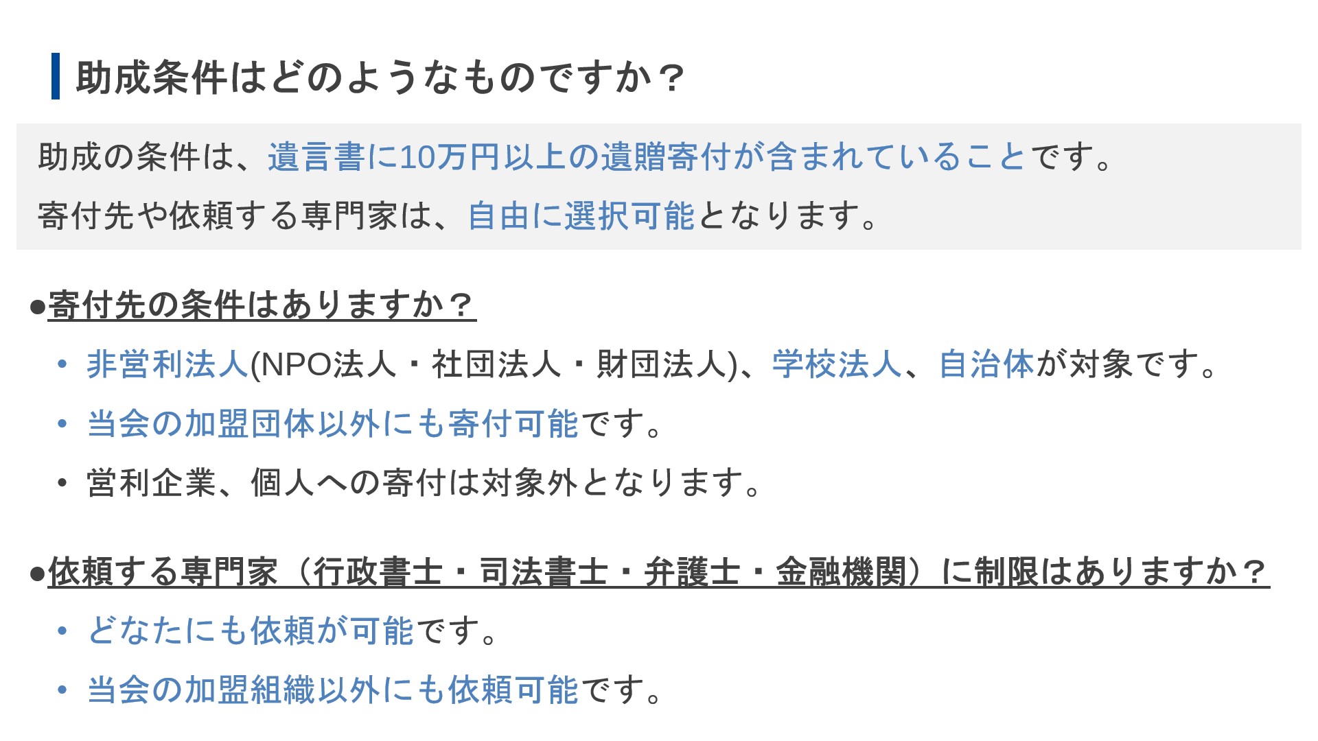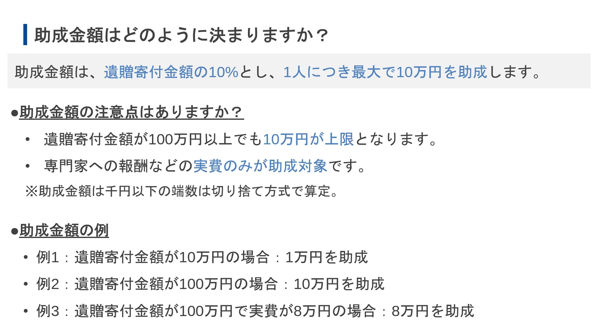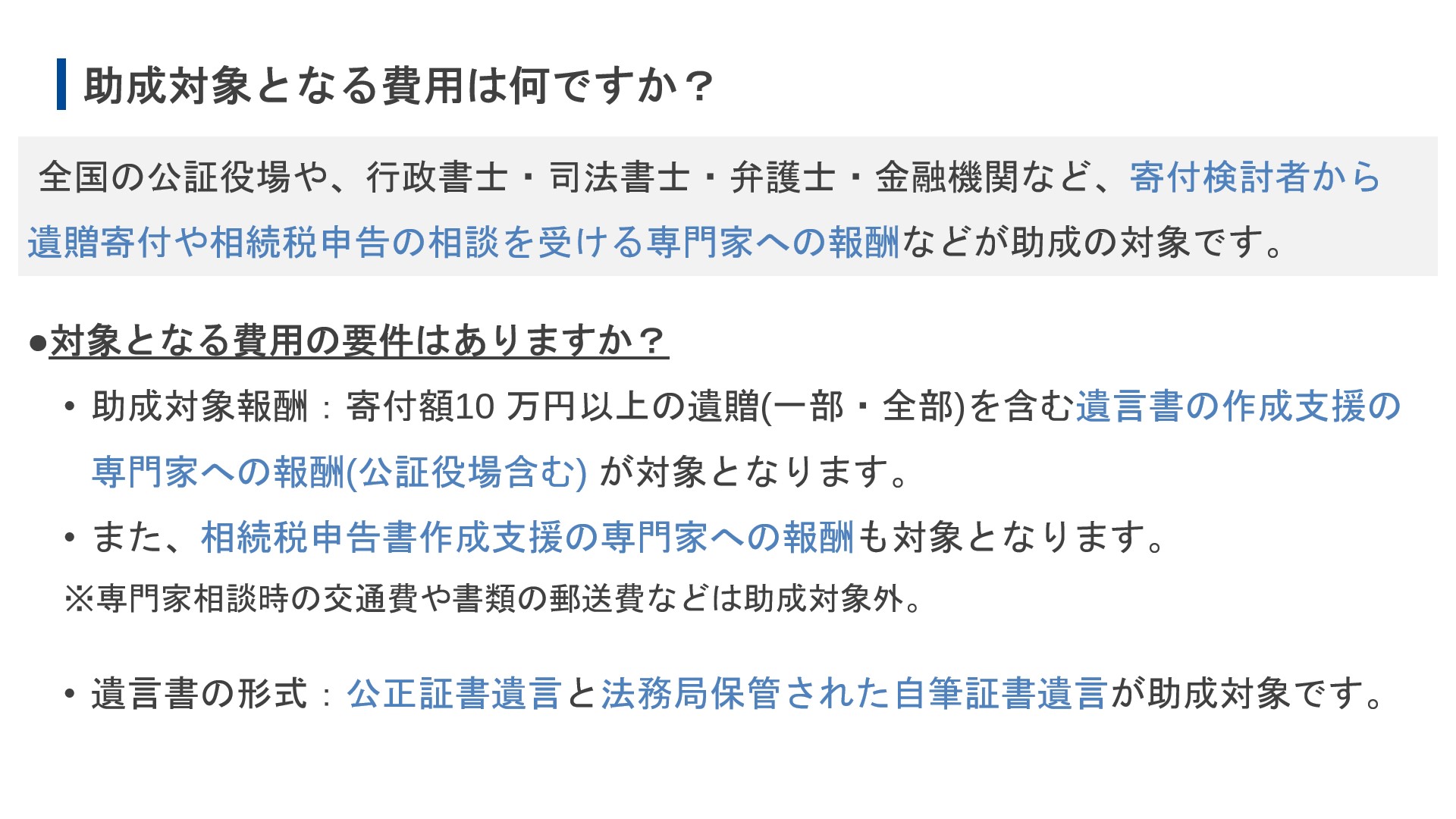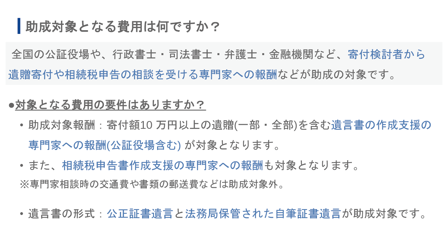 - 助成対象報酬:寄付額 10 万円以上の遺贈(一部・全部)を含む遺言書の作成支援、相続税申告書作成支援の専門家への報酬(公証役場を含む)