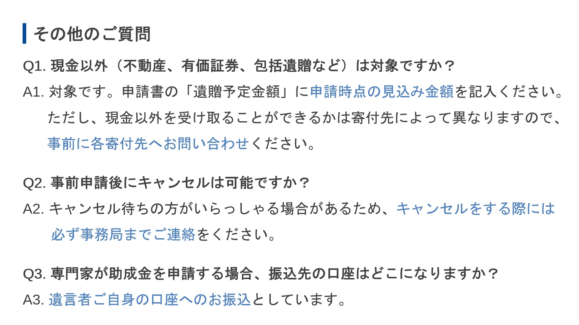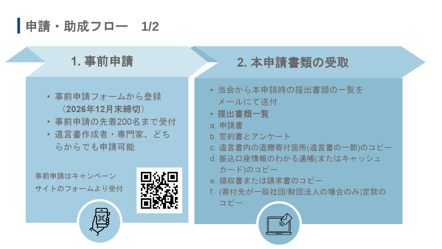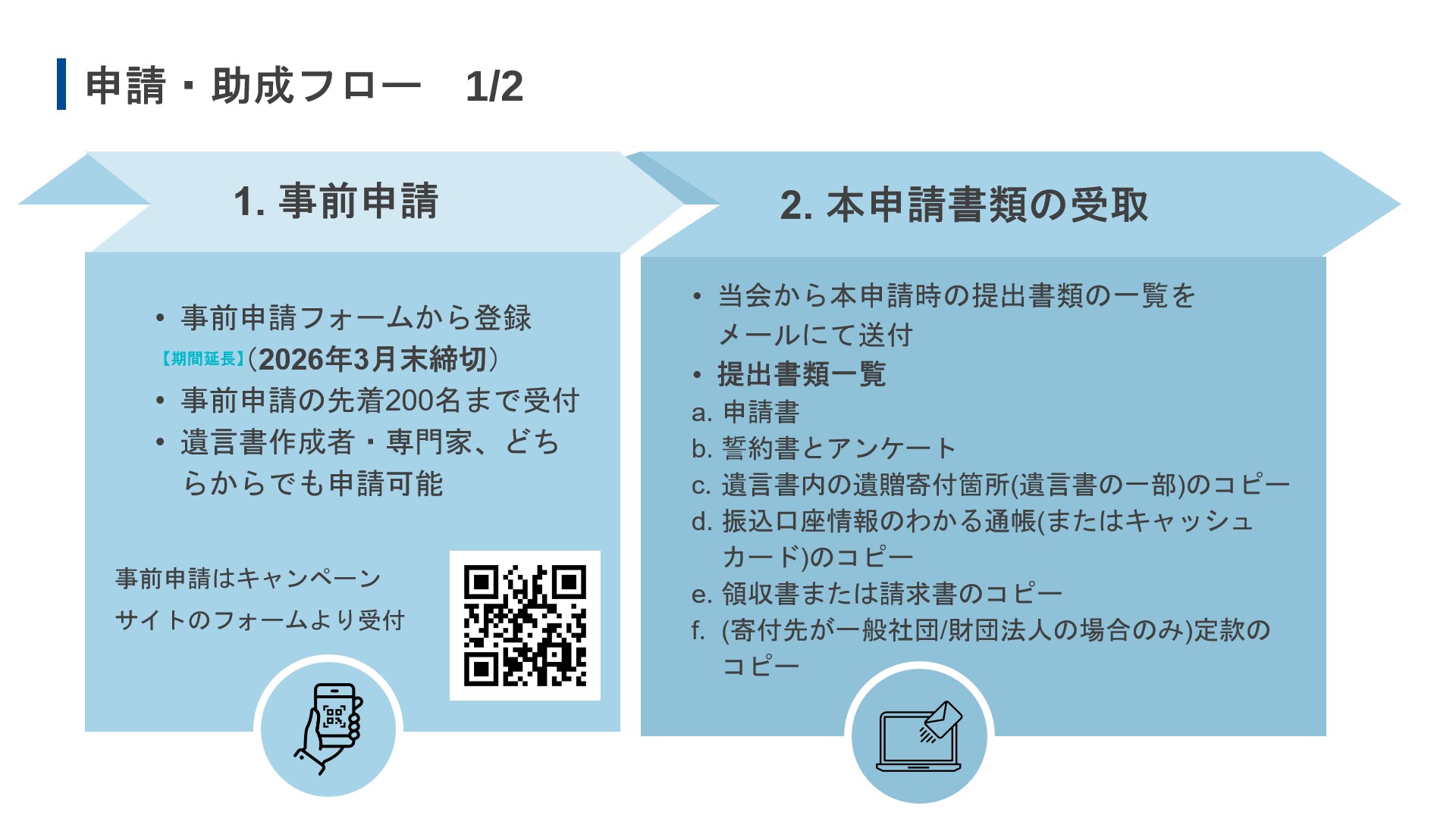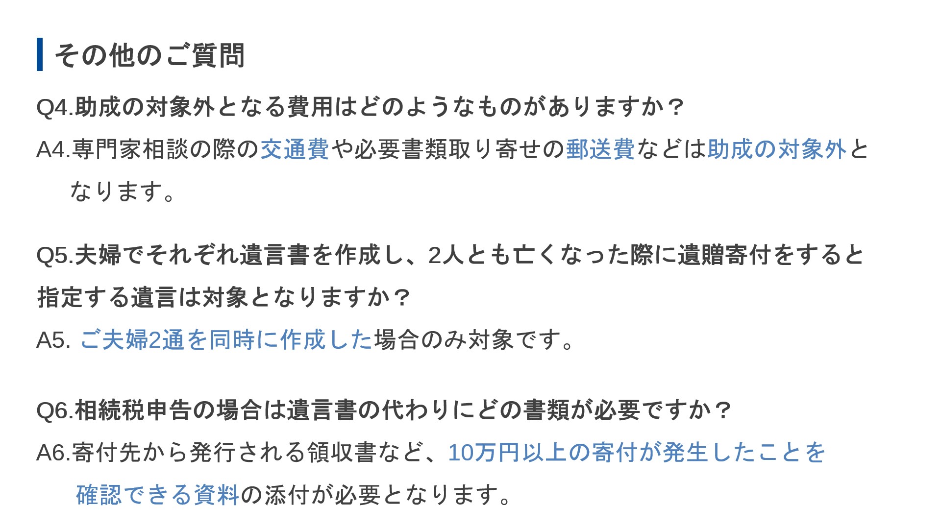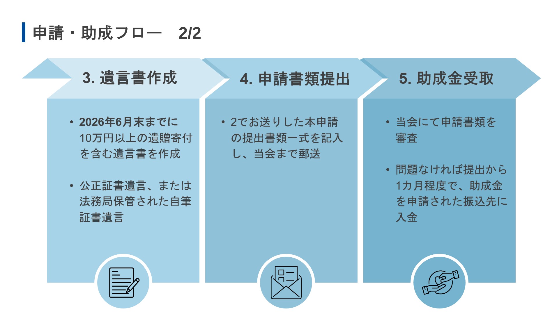 - 助成対象報酬:寄付額 10 万円以上の遺贈(一部・全部)を含む遺言書の作成支援、相続税申告書作成支援の専門家への報酬(公証役場を含む)