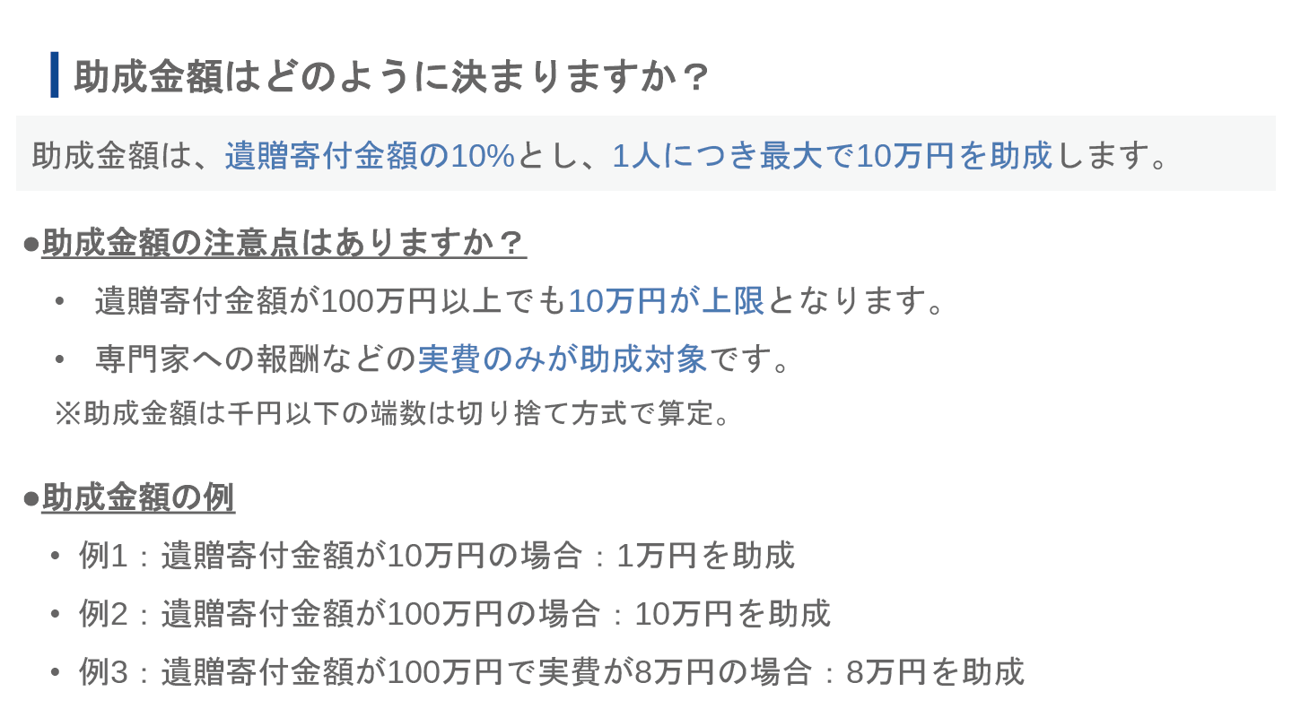 助成額については、遺言書作成時の寄付予定額より計算をさせていただきます。