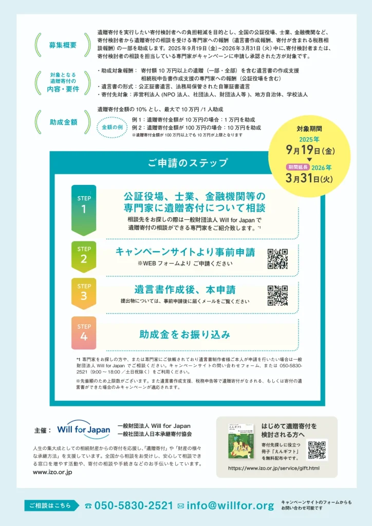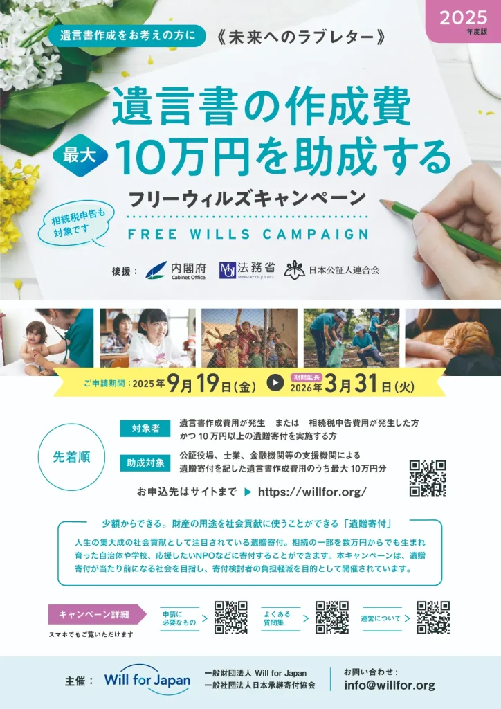 遺贈寄付の遺言書作成費用を助成する「フリーウィルズキャンペーン2025」について、事前申請の締切を「2026年3月末」まで延長することが決定いたしました。こちらは、「フリーウィルズキャンペーン」に対する企業からのご協賛や […] -