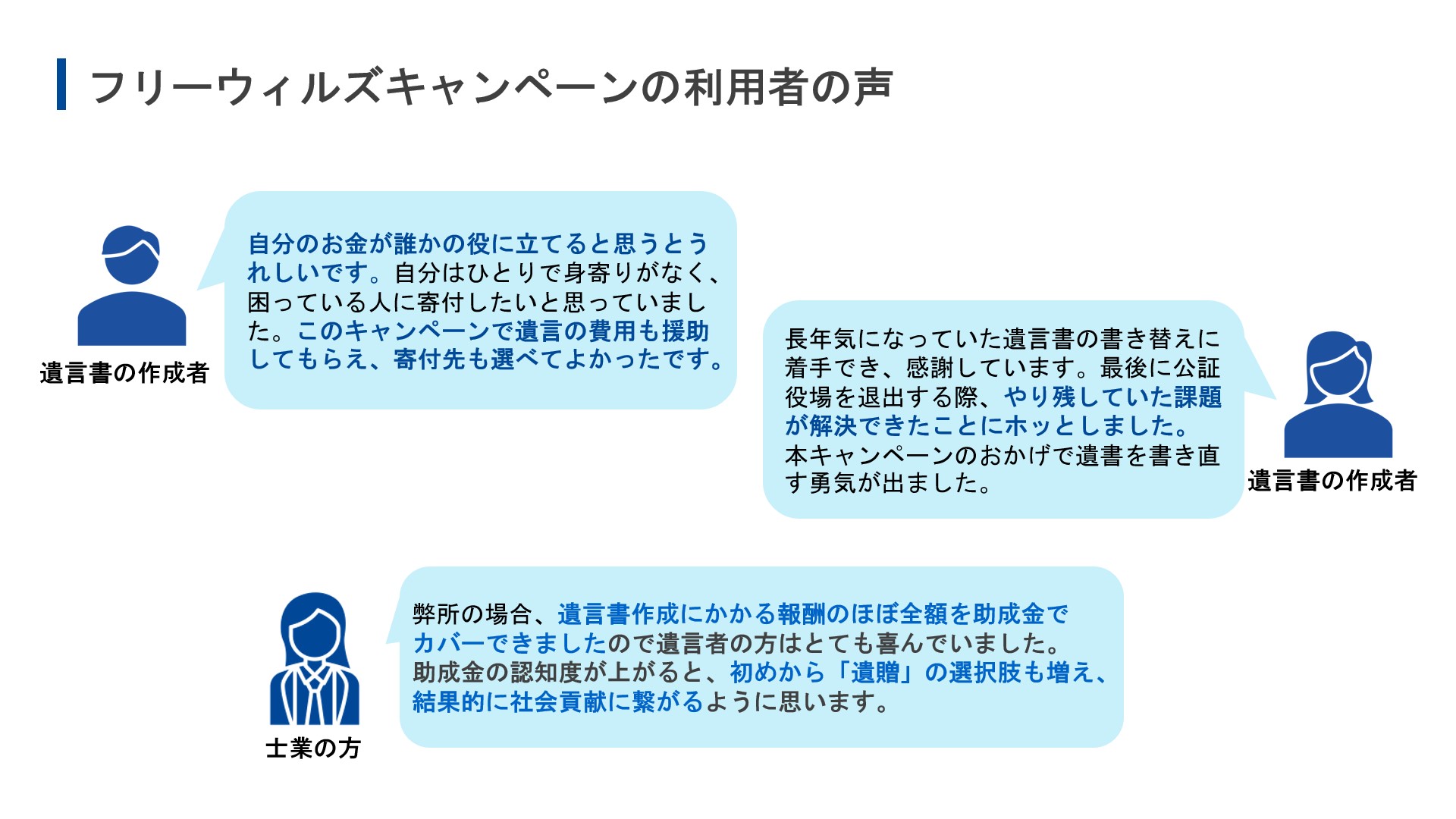 この現状を改善するため、私たちは、遺贈寄付を具体的に検討するきっかけとして、「フリーウィルズキャンペーン」を実施いたします。