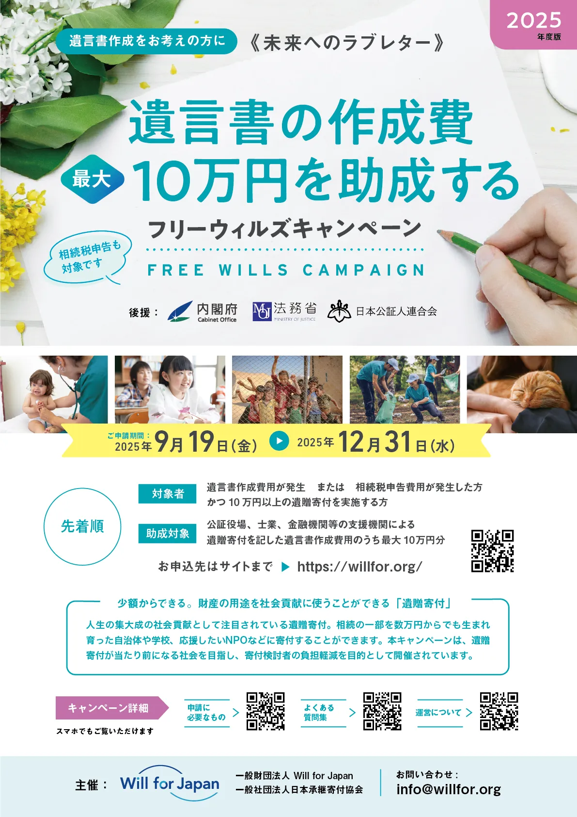 フリーウィルズキャンペーンとは、遺贈寄付の遺言書を作成する専門家報酬を助成するキャンペーンです。遺贈寄付実行のための専門家報酬の一部(最大10万円)を助成します。