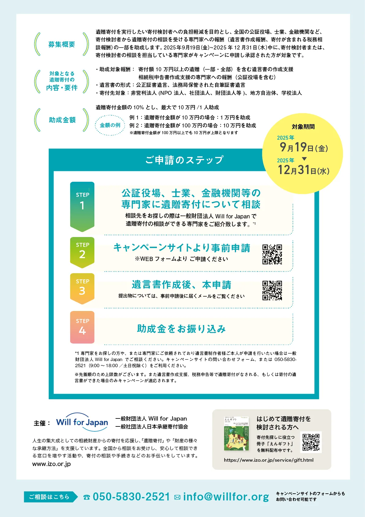 このキャンペーンは、全国の士業、金融機関等の遺贈寄付の相談を受ける専門家を対象に行います。寄付検討者の負担軽減を目的として開催されています。